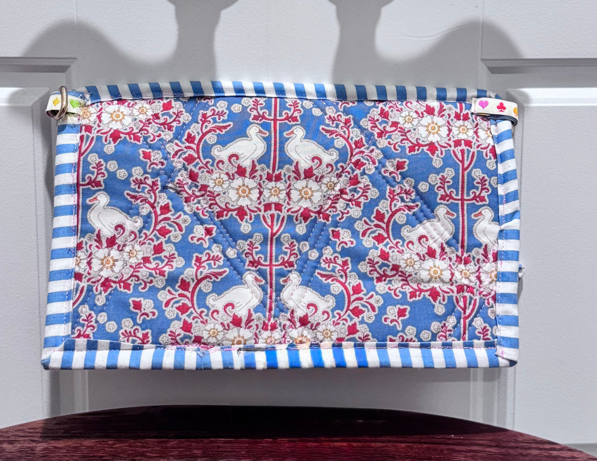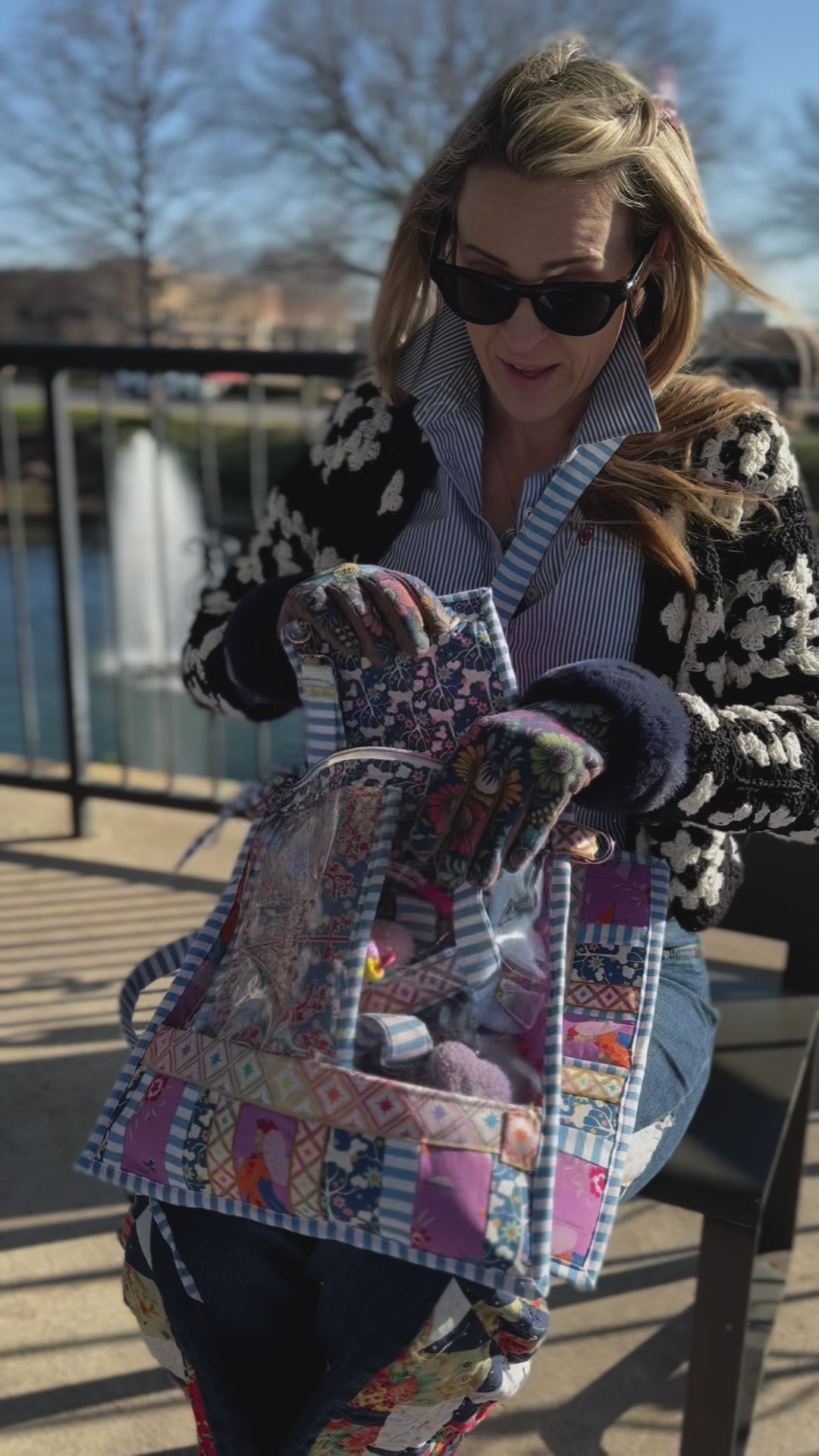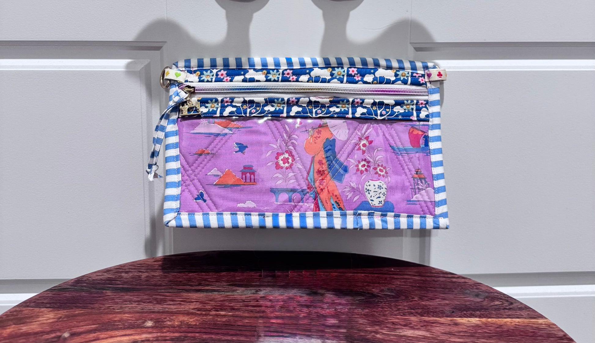Introducing our Small Project Bag in the beautiful Bloomsville and Jubilee Collections featuring a Violet print from designer Tilda fabric and gold sewing machine zipper pull. Perfect for all your crafting needs, with a vinyl see-through pocket for easy access and storage. Its light weight and plushy feel make it a versatile piece that doubles as a clutch or small purse. Elevate your crafting experience today.
