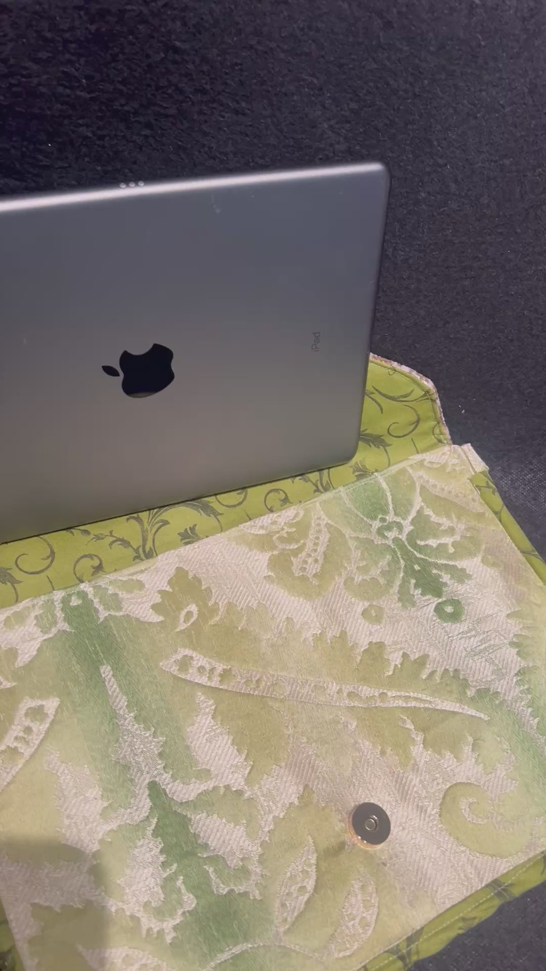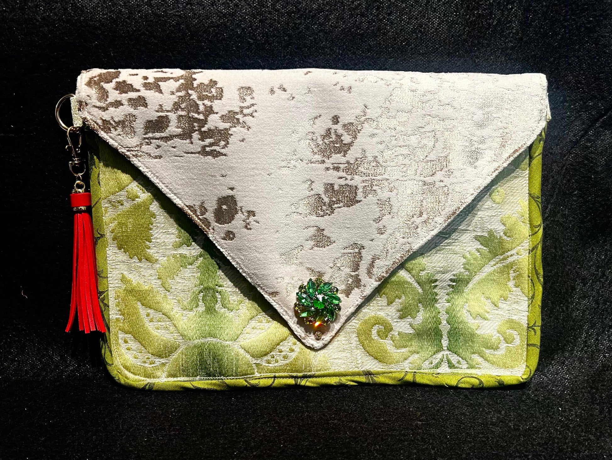 This envelope purse is one of a kind. Made from luxurious drapery fabric in a hand dyed brocade of green and gold mixed with a sumptuous metallic painted cream velvet, this bag is any designer's dream accessory.
