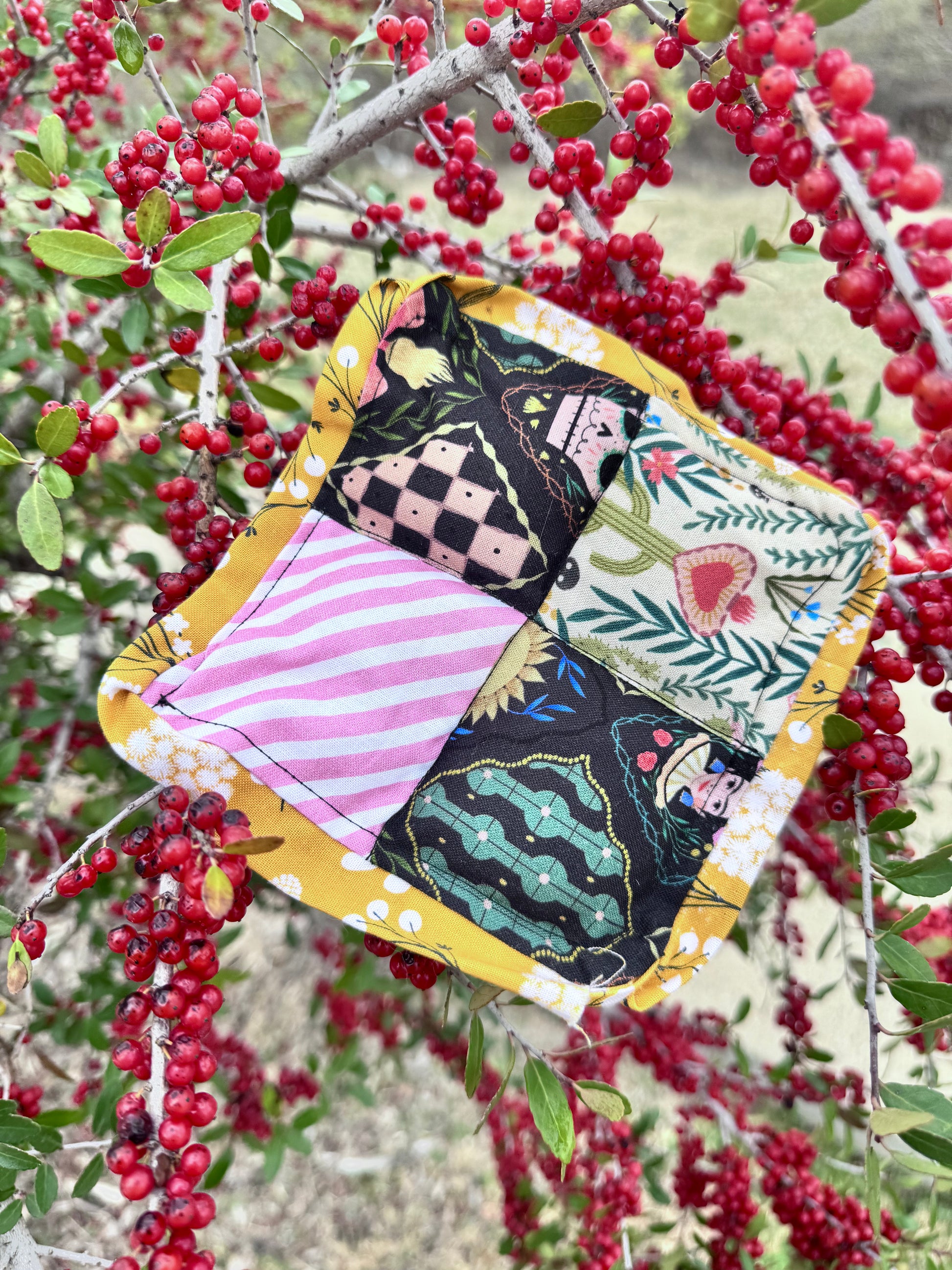 Foursquare Mug Rug Coaster Small features Mexicana vibes and sacred heart fabric from dear Stella.