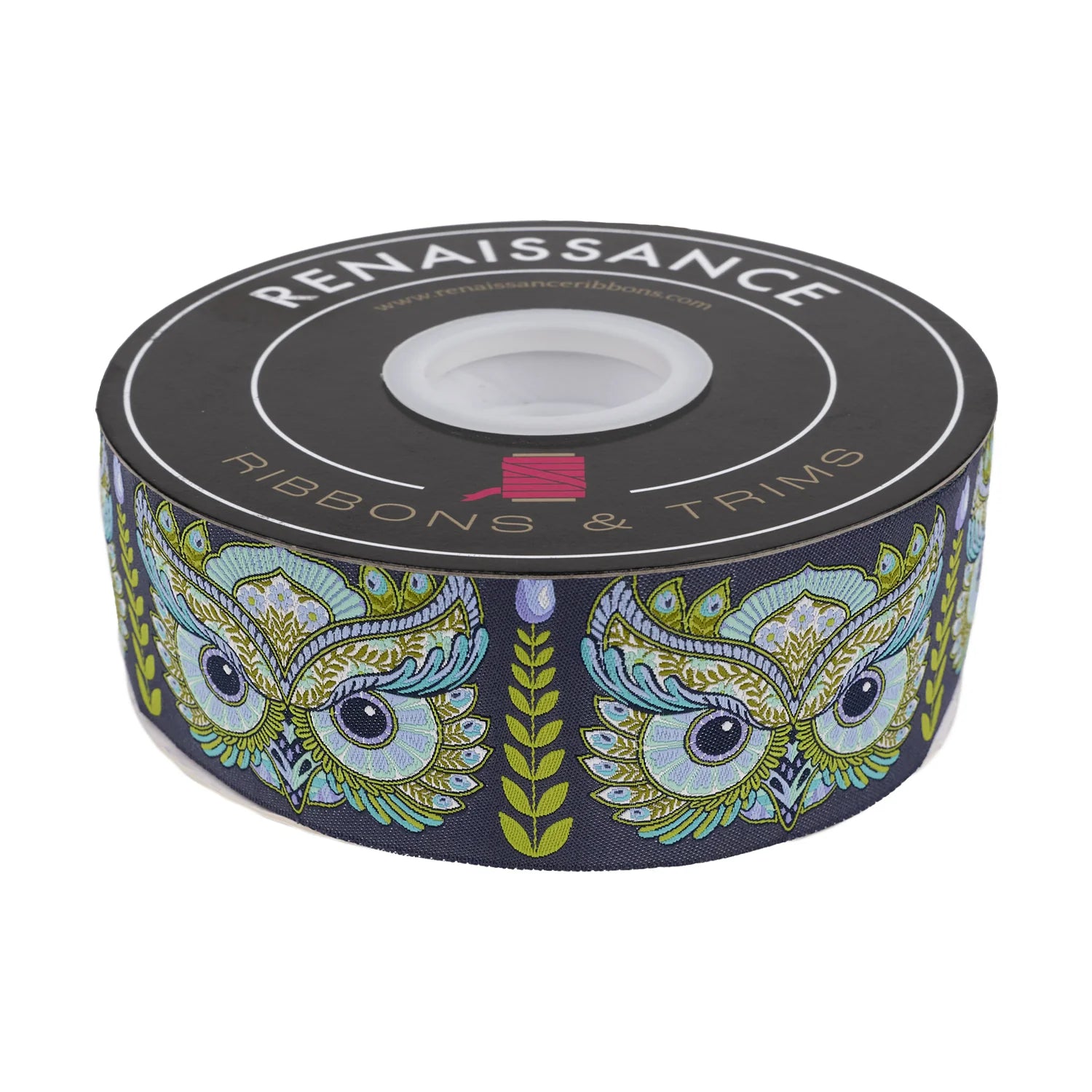Discover the enchantment of Tula Pink’s Full Moon Forest II with this stunning 2" wide Jacquard Woven Ribbon, exclusively from FreeSpirit Fabrics. Featuring a moody blue-gray background, this ribbon is adorned with intricately detailed, ornate owls that capture the essence of whimsical woodland creatures.