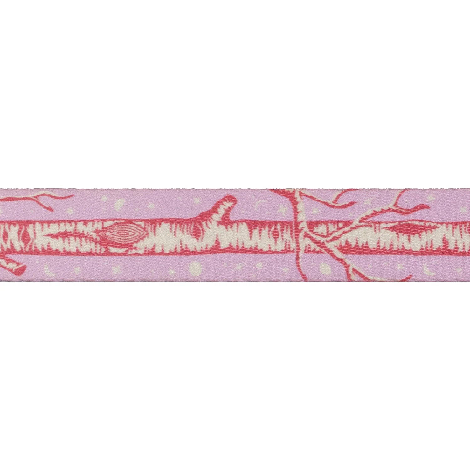 Step into a world of wonder with the “Little Tree in Honey” sublimated nylon webbing, a stunning addition to Tula Pink's Full Moon Forest II collection. Measuring a versatile 1" wide, this webbing features a captivating tree design in a bubblegum pink on the front, paired with a mesmerizing space sprinkles design in coordinating pink and white on the back.