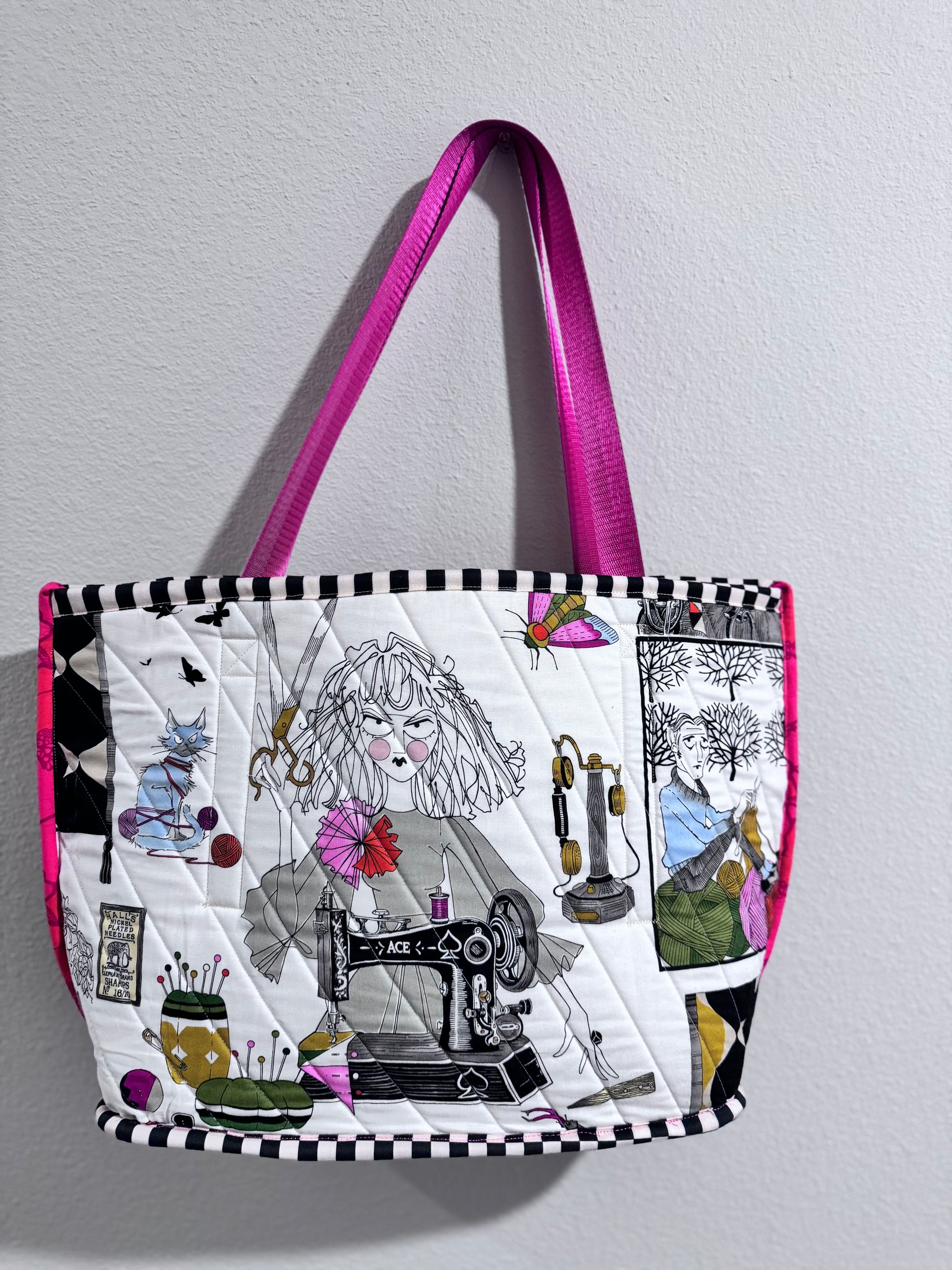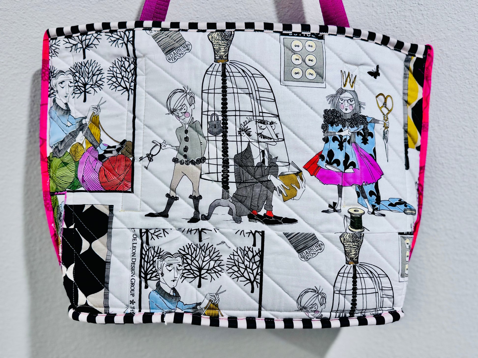 Take your crafting on-the-go with the Ghastlie Craft Tote Project Bag. Made with a rare bright Alexander Henry print, this tote features a convenient laptop sleeve and appliqué details. Stay organized and stylish while creating your next masterpiece.