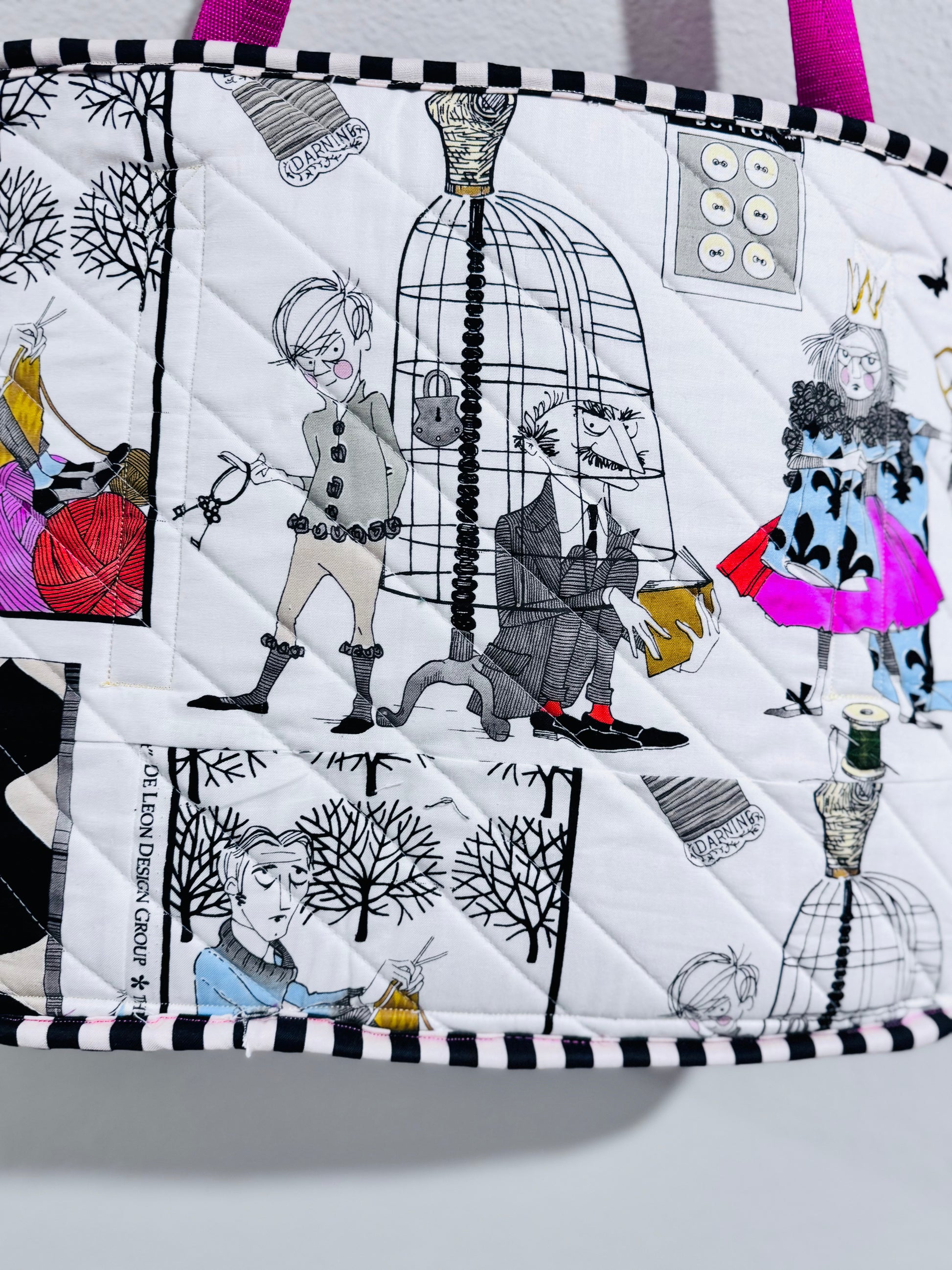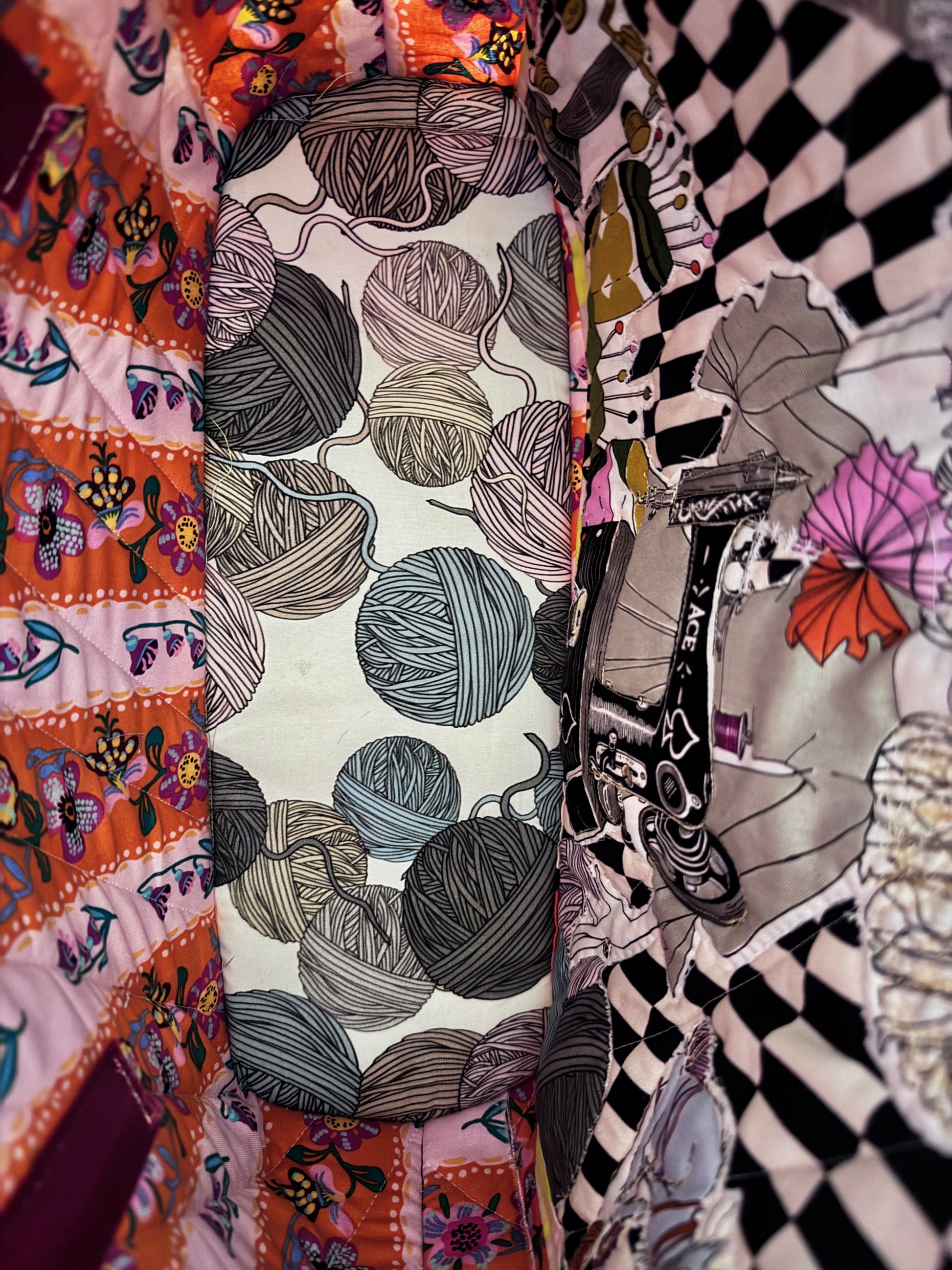 It is made with foam batting ( Annie’s soft and stable) to give it shape and suppleness - with bound edges using Dear Stella’s ticket to ride and magenta rose webbing / strapping sewn on the inside. Custom yarn print bottom for my 🧶 fellow yarnies and a bright pink and tangerine wallpaper print from Nathalie Lete’s A Spring in Paris Collection.