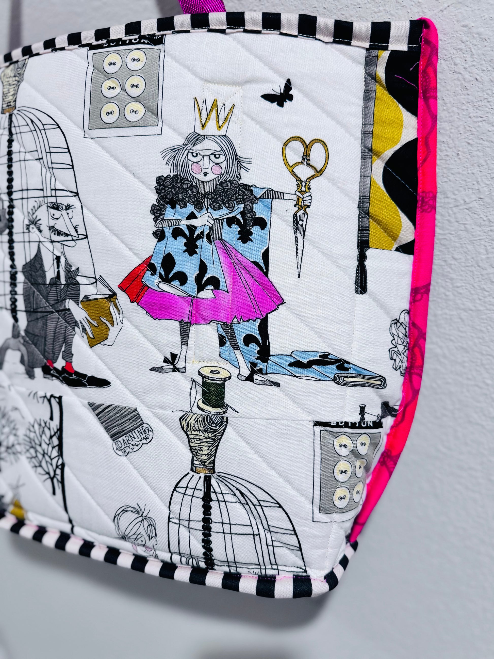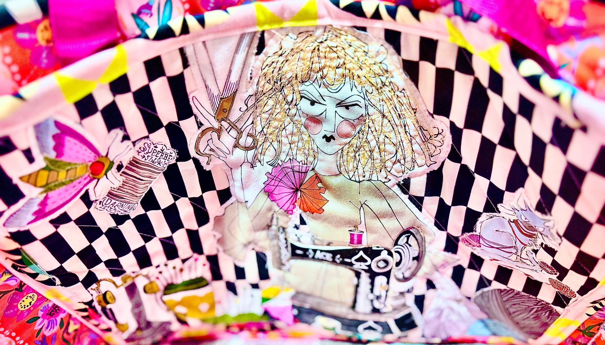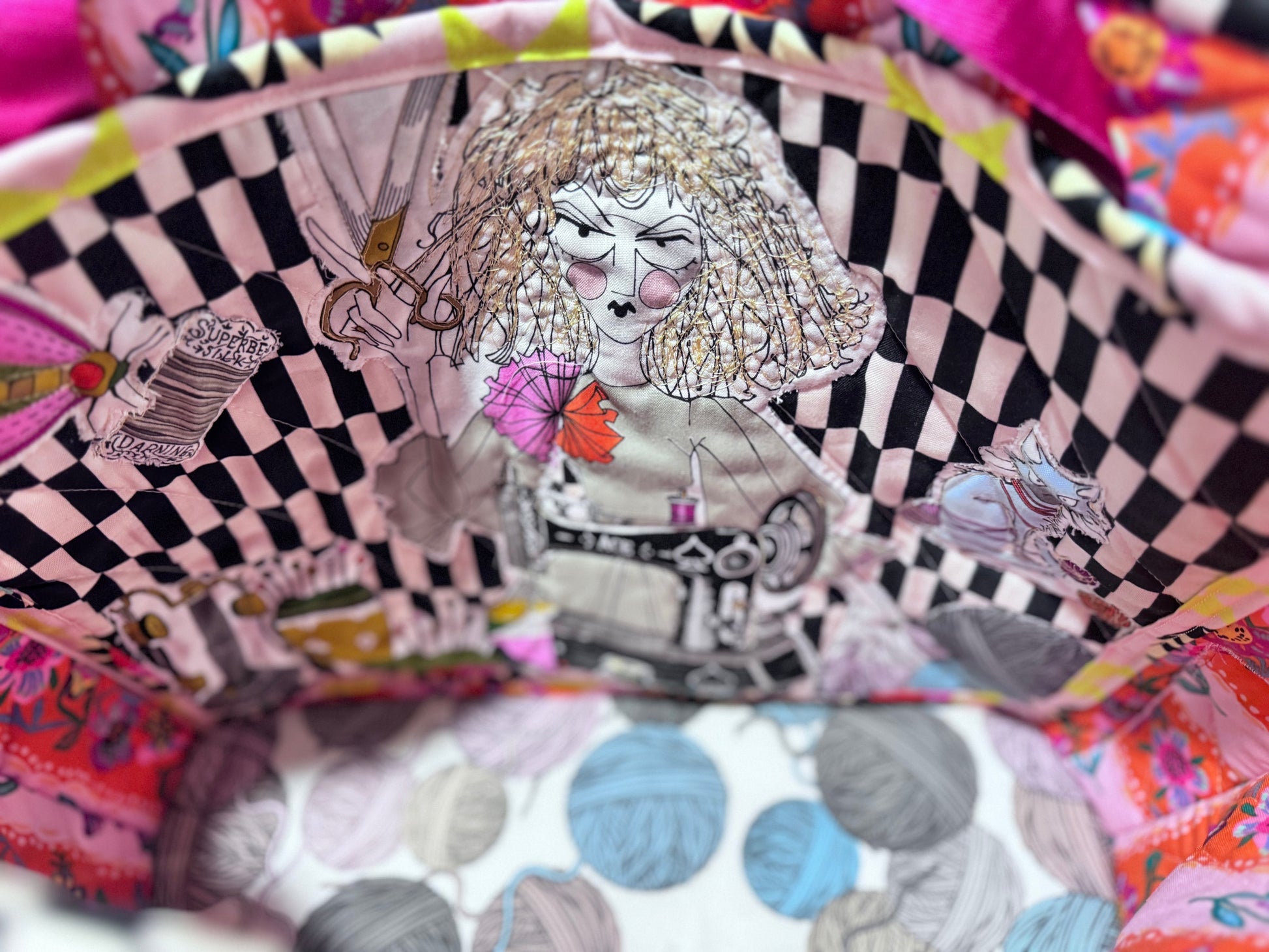 It features two of the Ghastlie Craft main Character holding the scissors - one is on the front the other is on the pocket and embroidered and all the whimsical Ghastlie characters and fun that the print is known for. The Pocket is heavily appliquéd and embroidered . The bottom features a fun print from the Kaleidoscope collection of Annabel Wrigley.