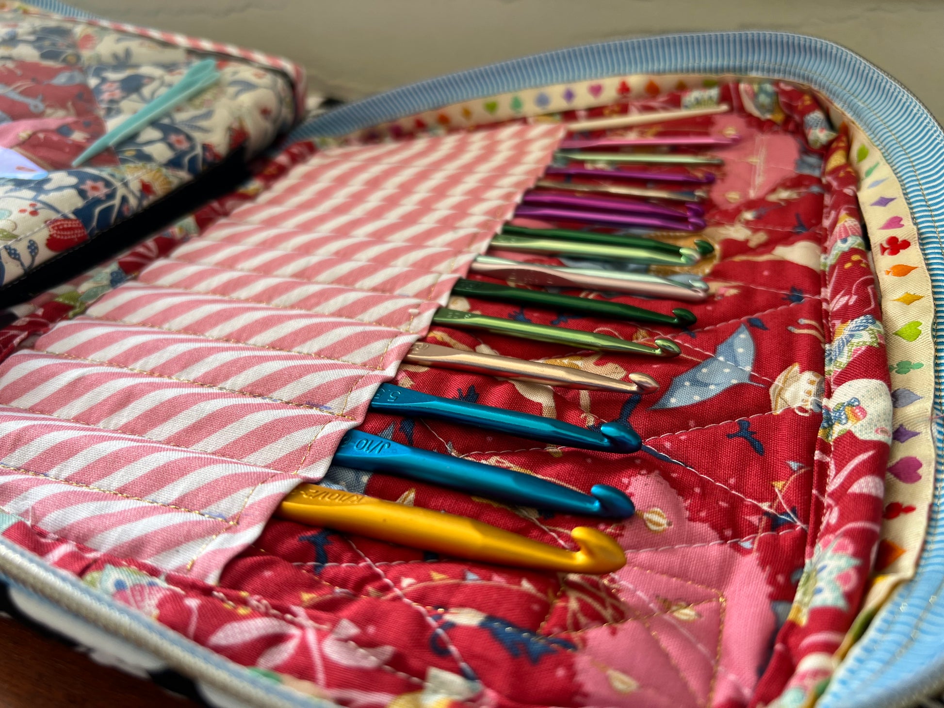 Expertly organize your knitting needles and embroidery supplies with our made-to-order case. Choose from a variety of fun and cute colors and designer fabrics to personalize your case. Keep your supplies in one place for easy and convenient access.