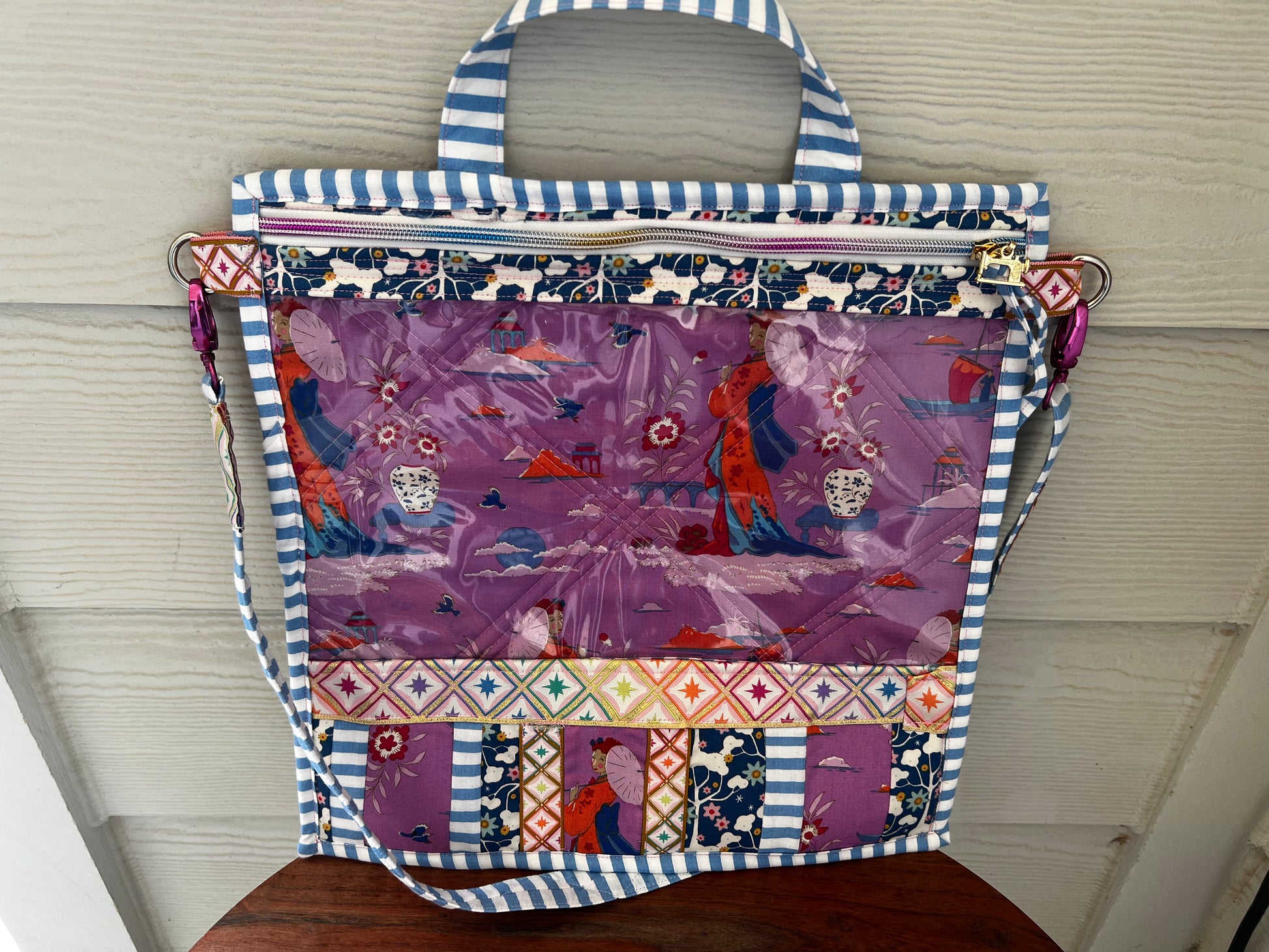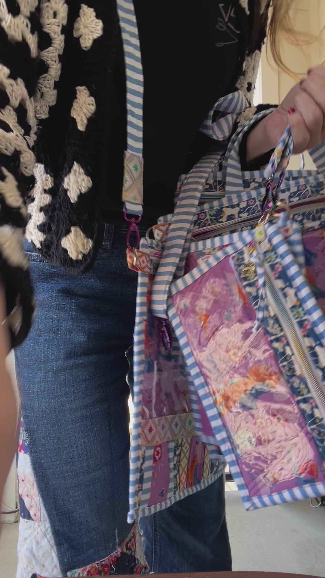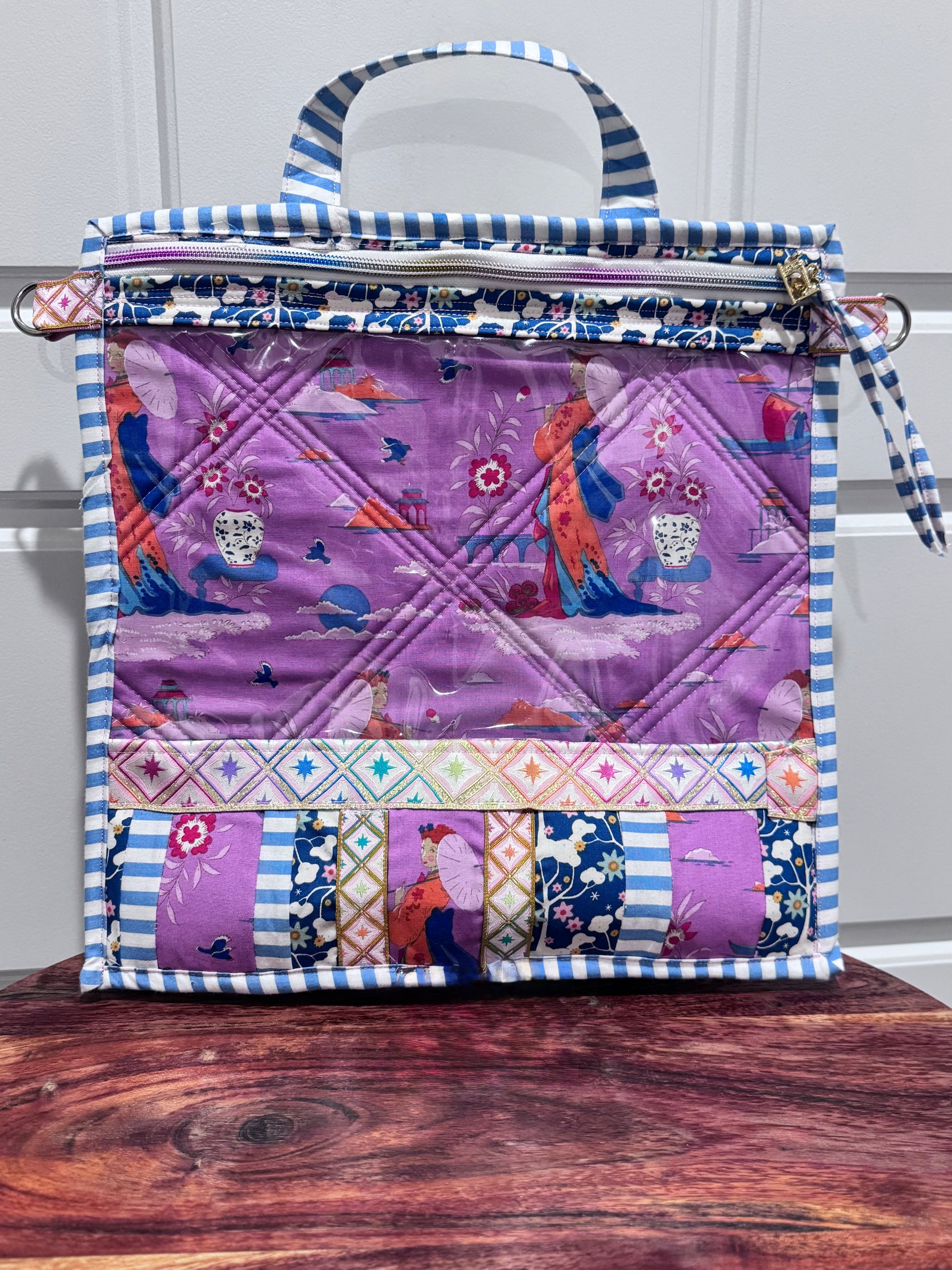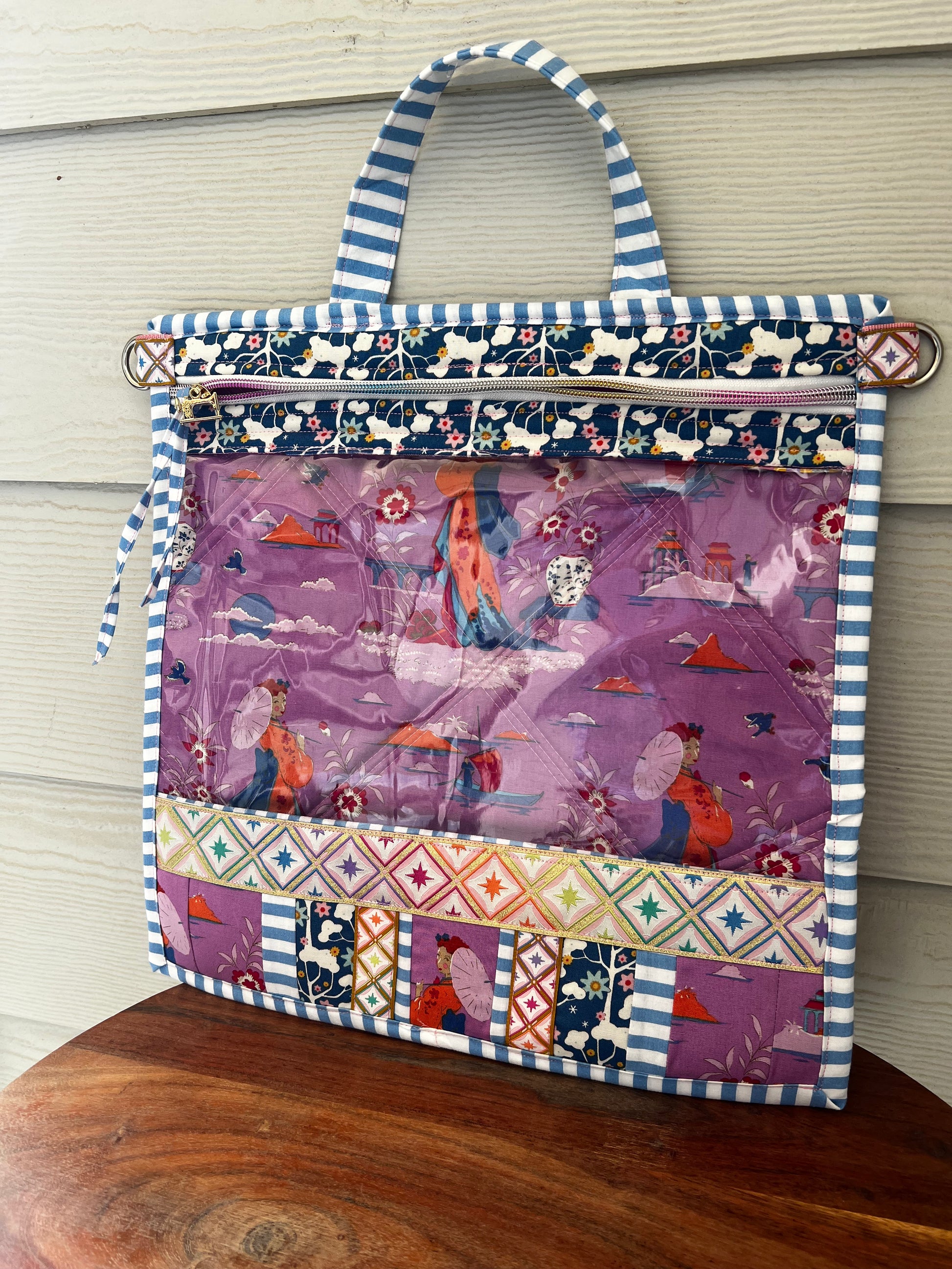 It features two d rings on the side to clip on to your strap for easy on the go wear or use the handle as a handbag too! It’s lightweight, easy to store, and you can see your projects readily.