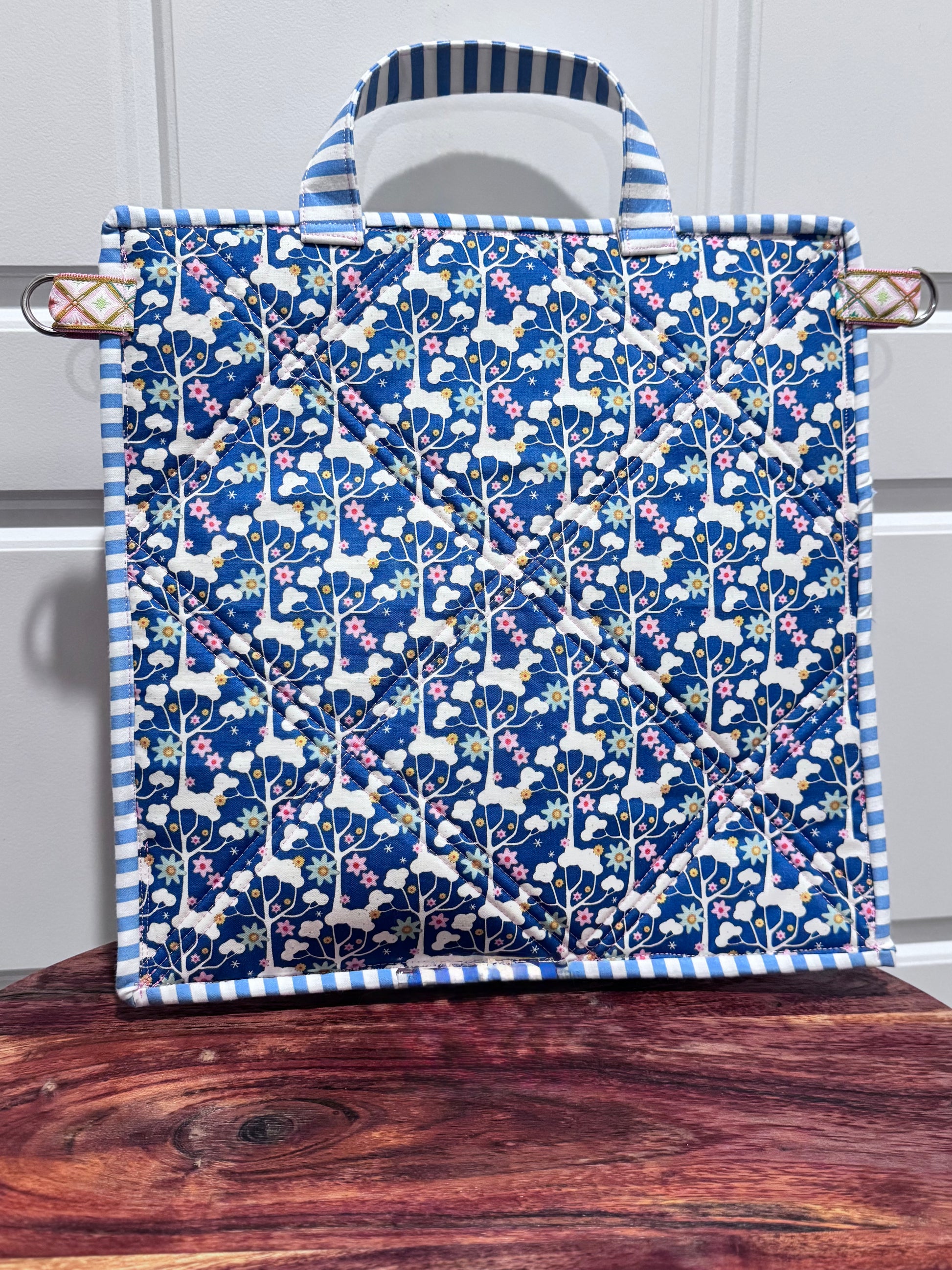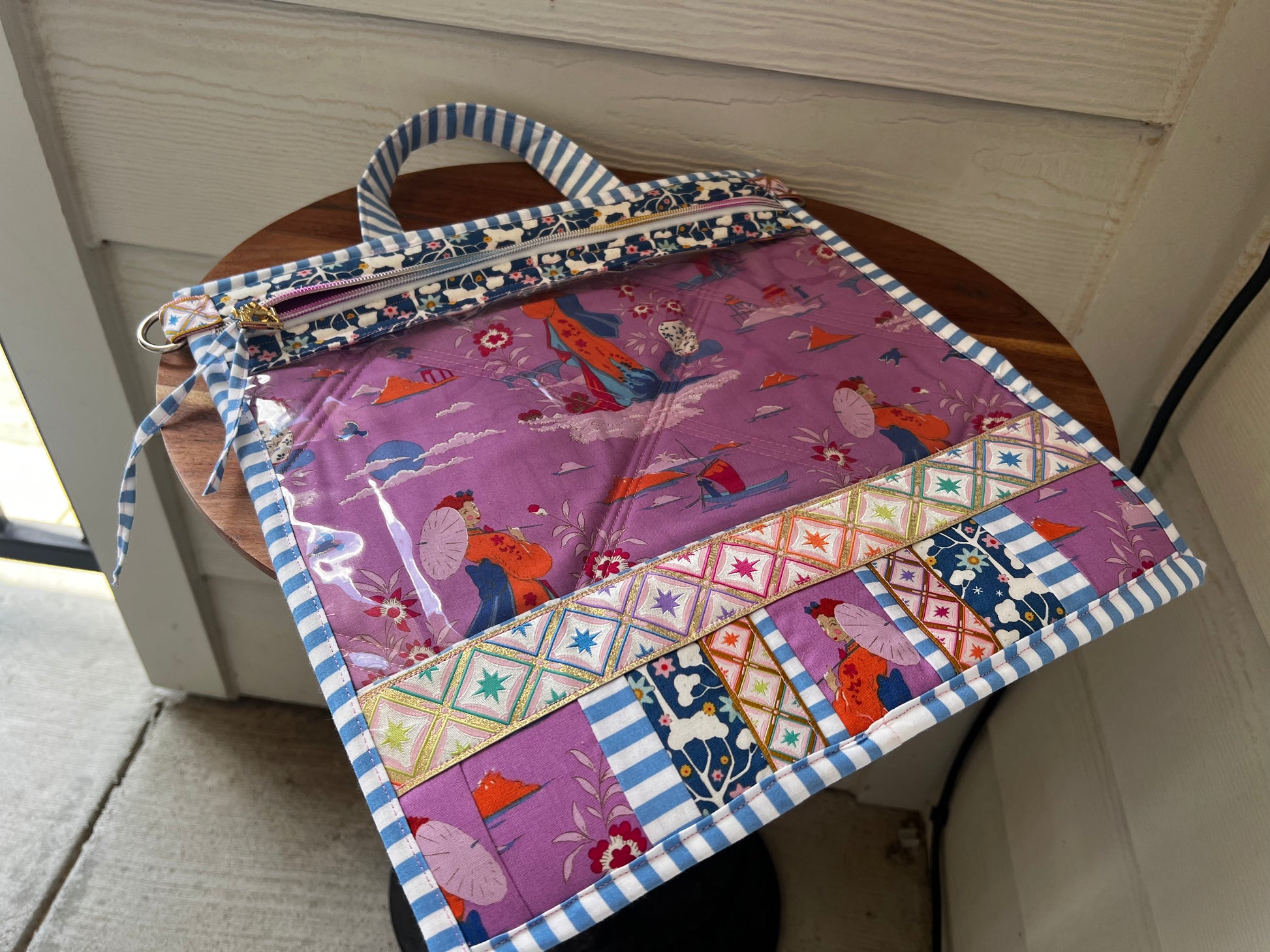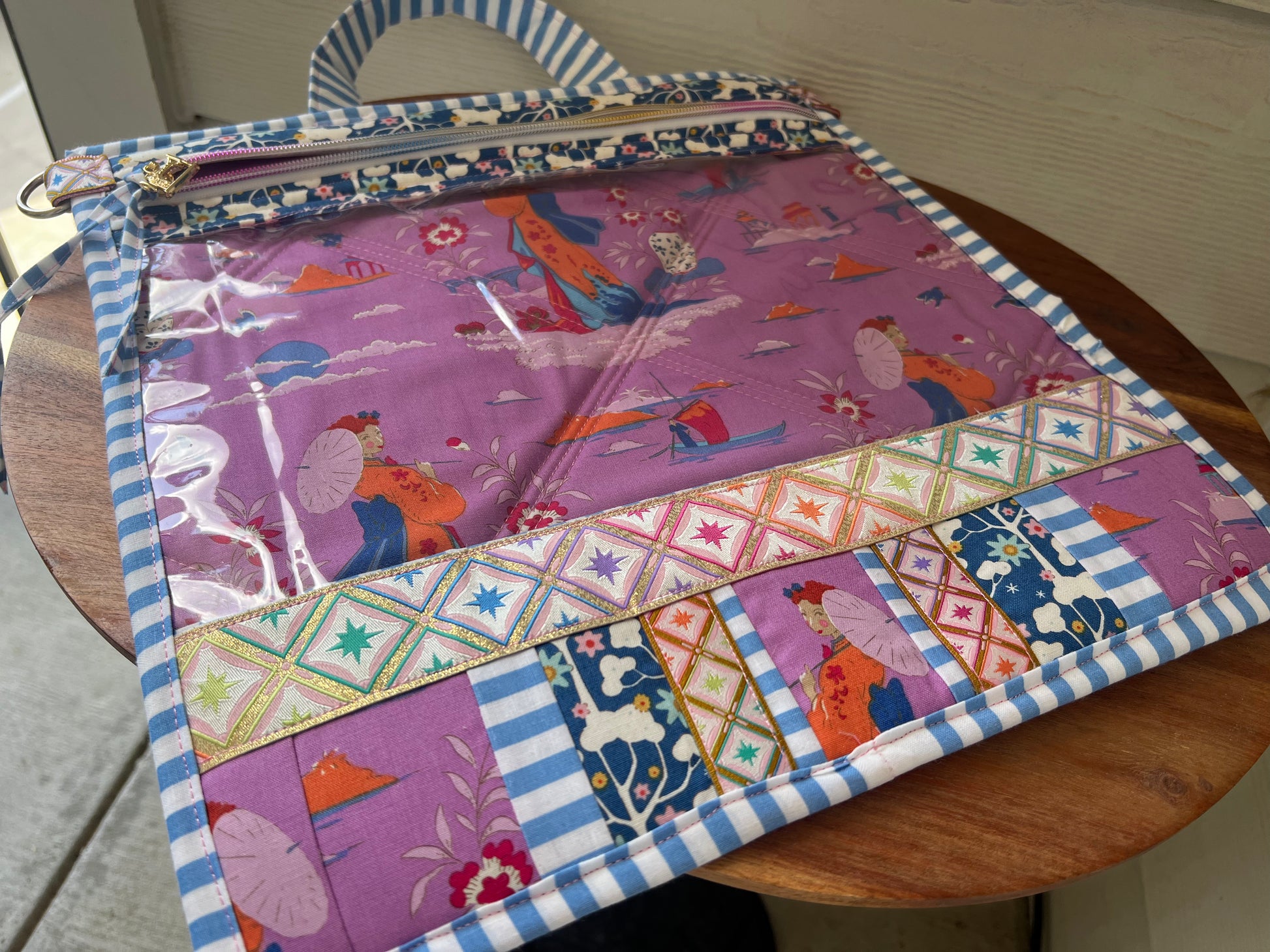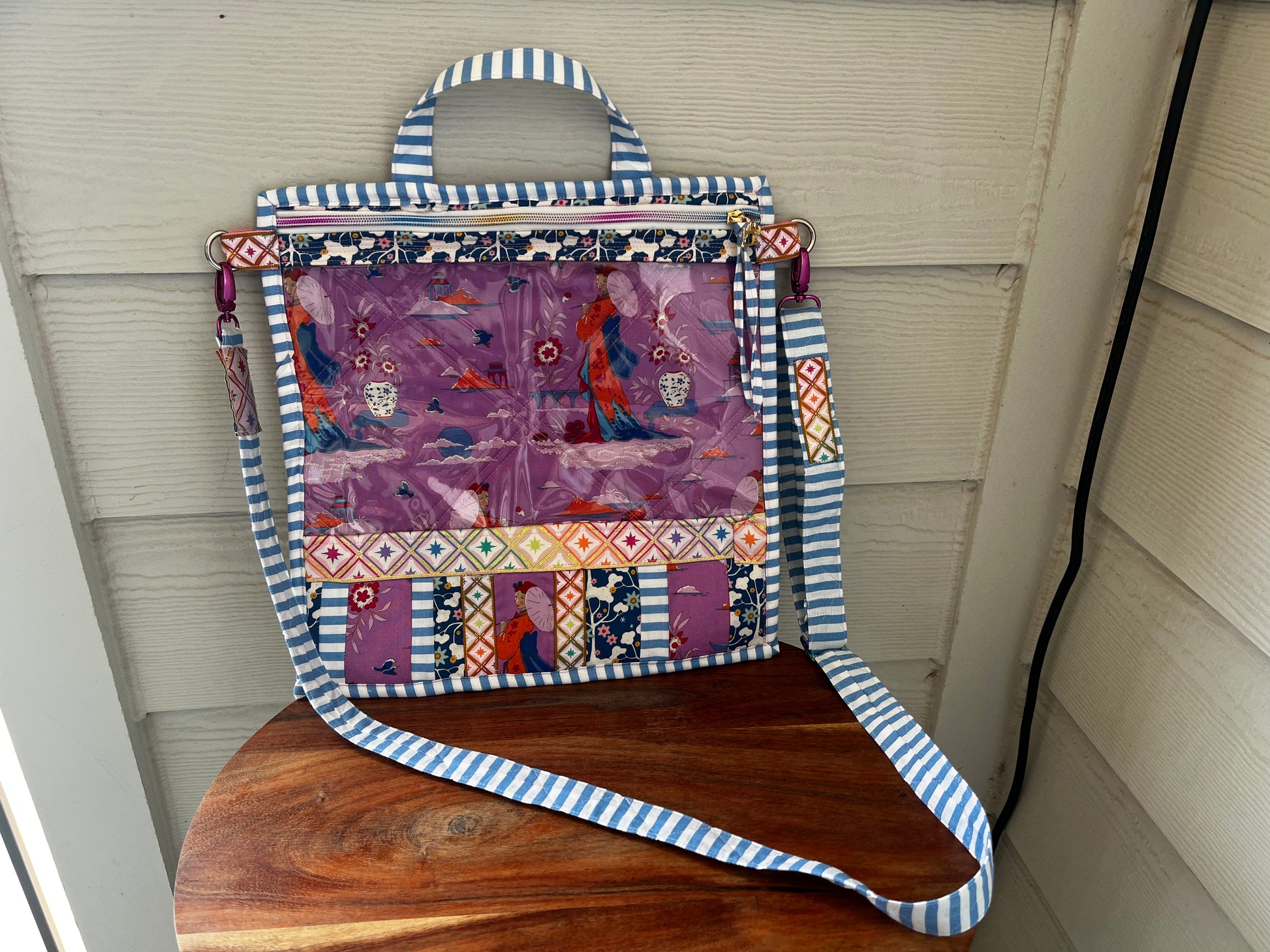 It features two d rings on the side to clip on to your strap for easy on the go wear or use the handle as a handbag too! It’s lightweight, easy to store, and you can see your projects readily.