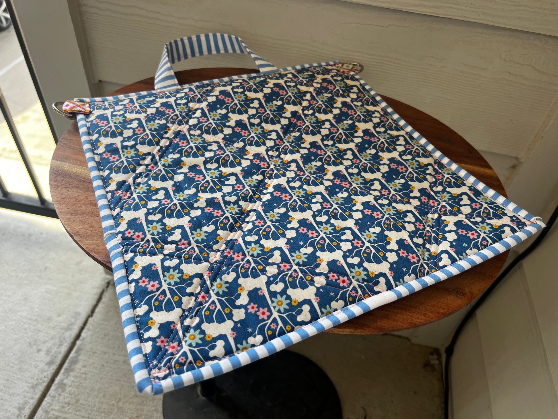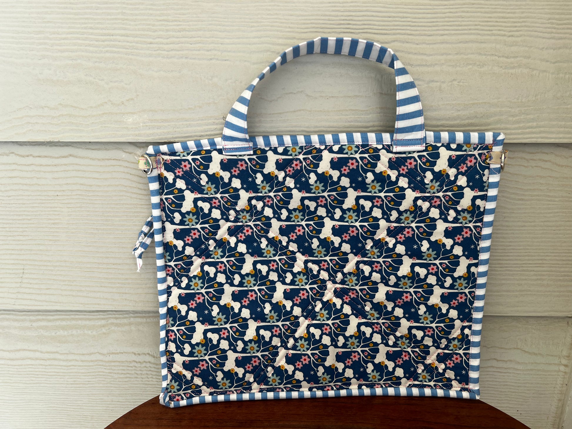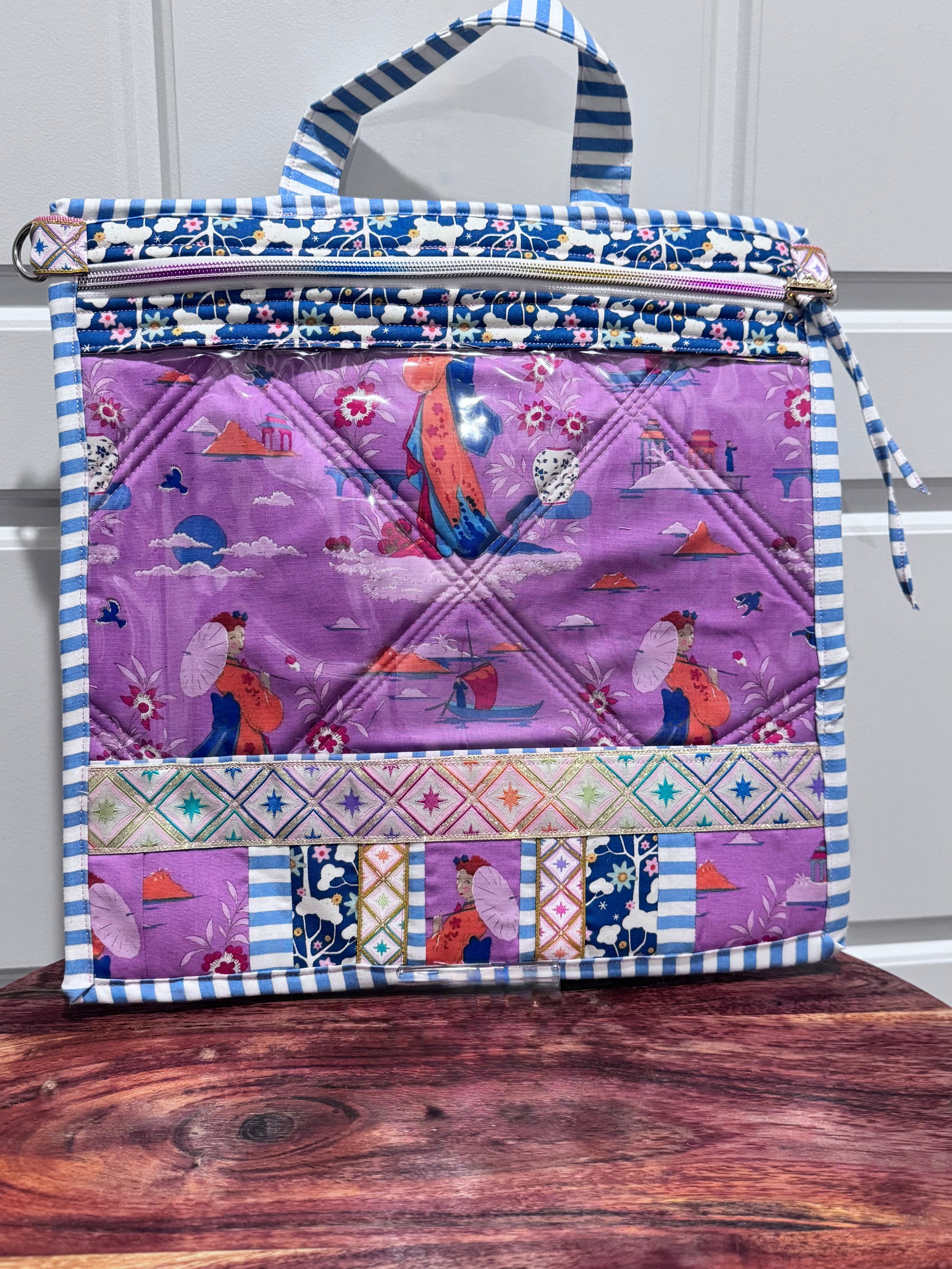 Introducing our Large Vinyl and Plush Cotton Project Bag in a beautiful blue and violet Tilda Bloomsville print, featuring a luxurious Tilda fabric in her Jubilee collection and gold sewing machine zipper pull. Perfect for all your crafting needs, with a vinyl see-through pocket for easy access and storage. Its light weight and plushy feel make it a versatile piece that doubles as a clutch or small purse. Elevate your crafting experience today.