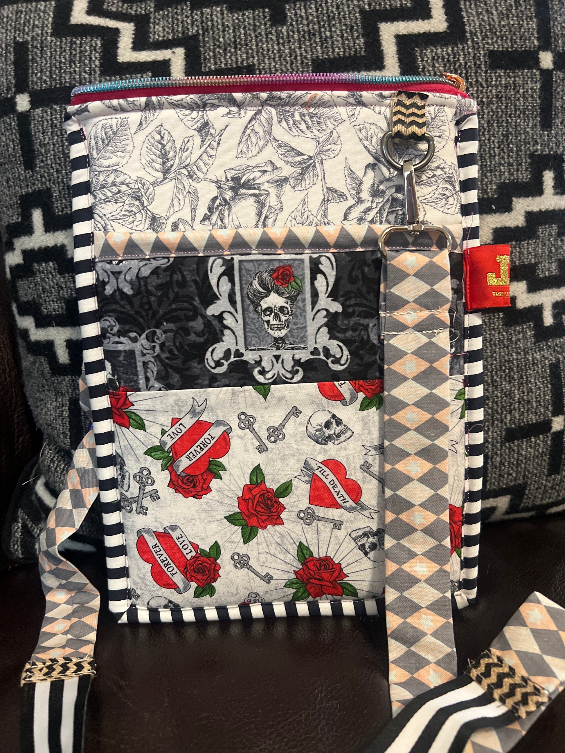 Spooky Bag Till Death Do Us Part Get ready to add a spooky touch to your style with the Spooky Bag Till Death Do Us Part collection by Northcott Fabrics. This crossbody purse features a zippered top pocket and plushie interior foam for added comfort. Perfect for any Halloween enthusiast, stay stylish and organized with this one-of-a-kind bag.