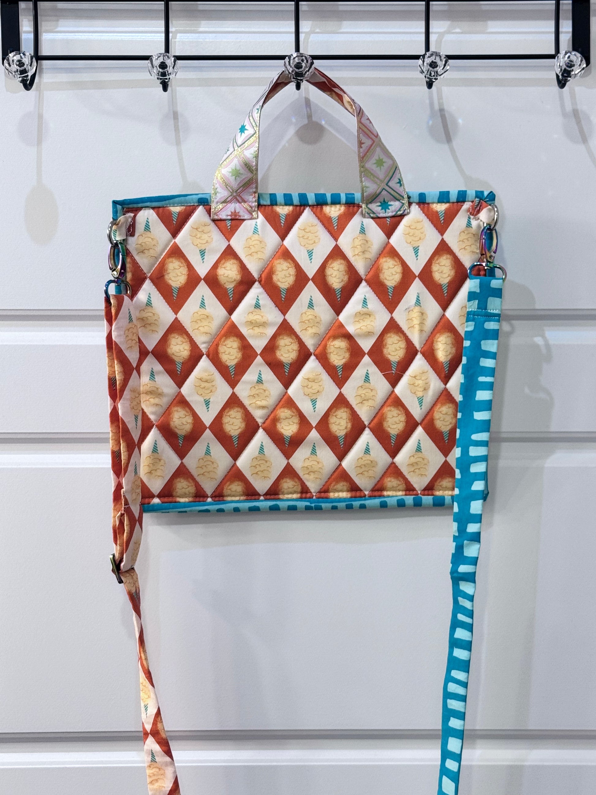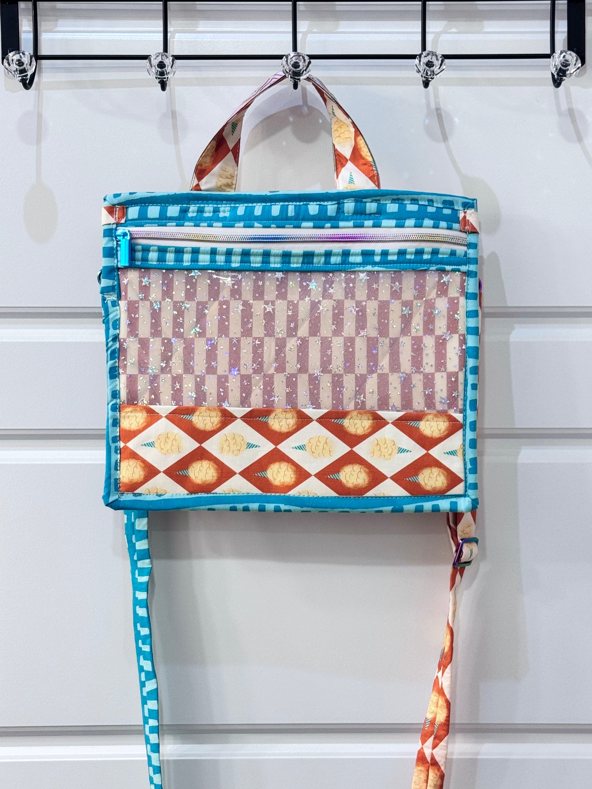 Introducing our Medium Project Bag in beautiful Ticket to Ride Collection Fabric from Dear Stella by Faye Guanipa and Custom printed Turquoise Teal Batik fabric. Perfect for all your crafting needs, with a holographic star vinyl see-through pocket for easy access and storage. Its light weight and plushy feel make it a versatile piece that doubles as a clutch or small purse. Elevate your crafting experience today.