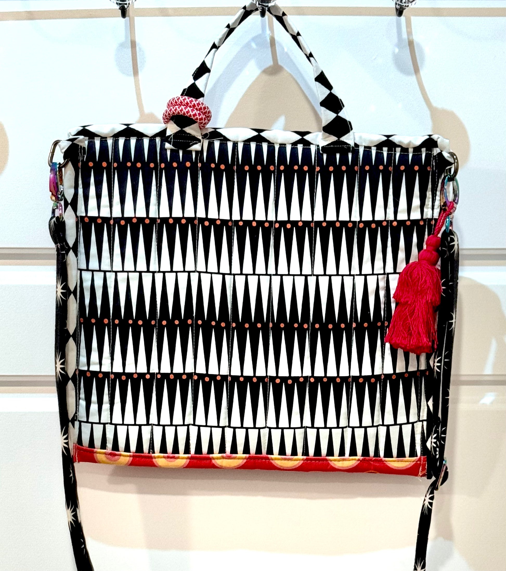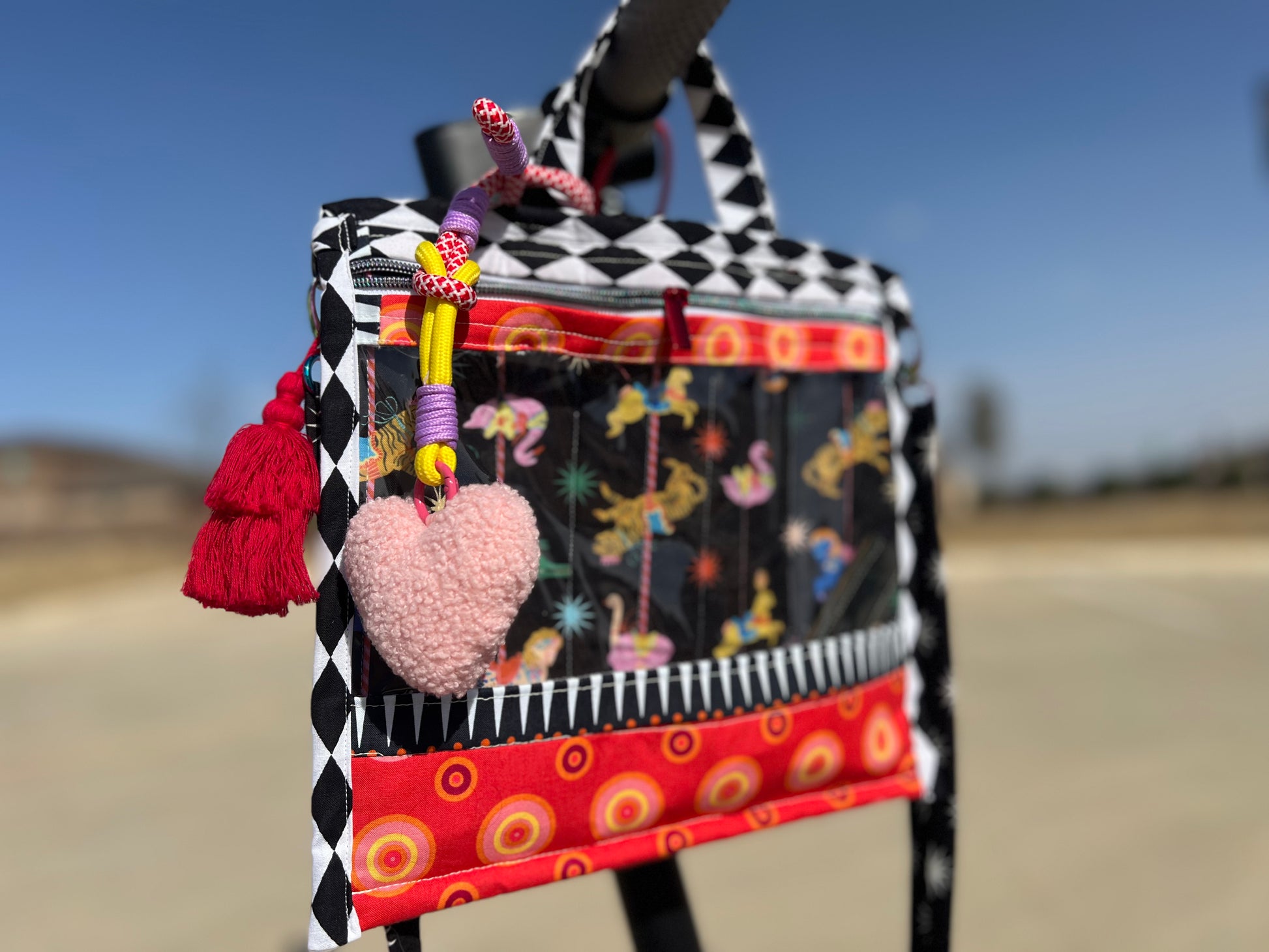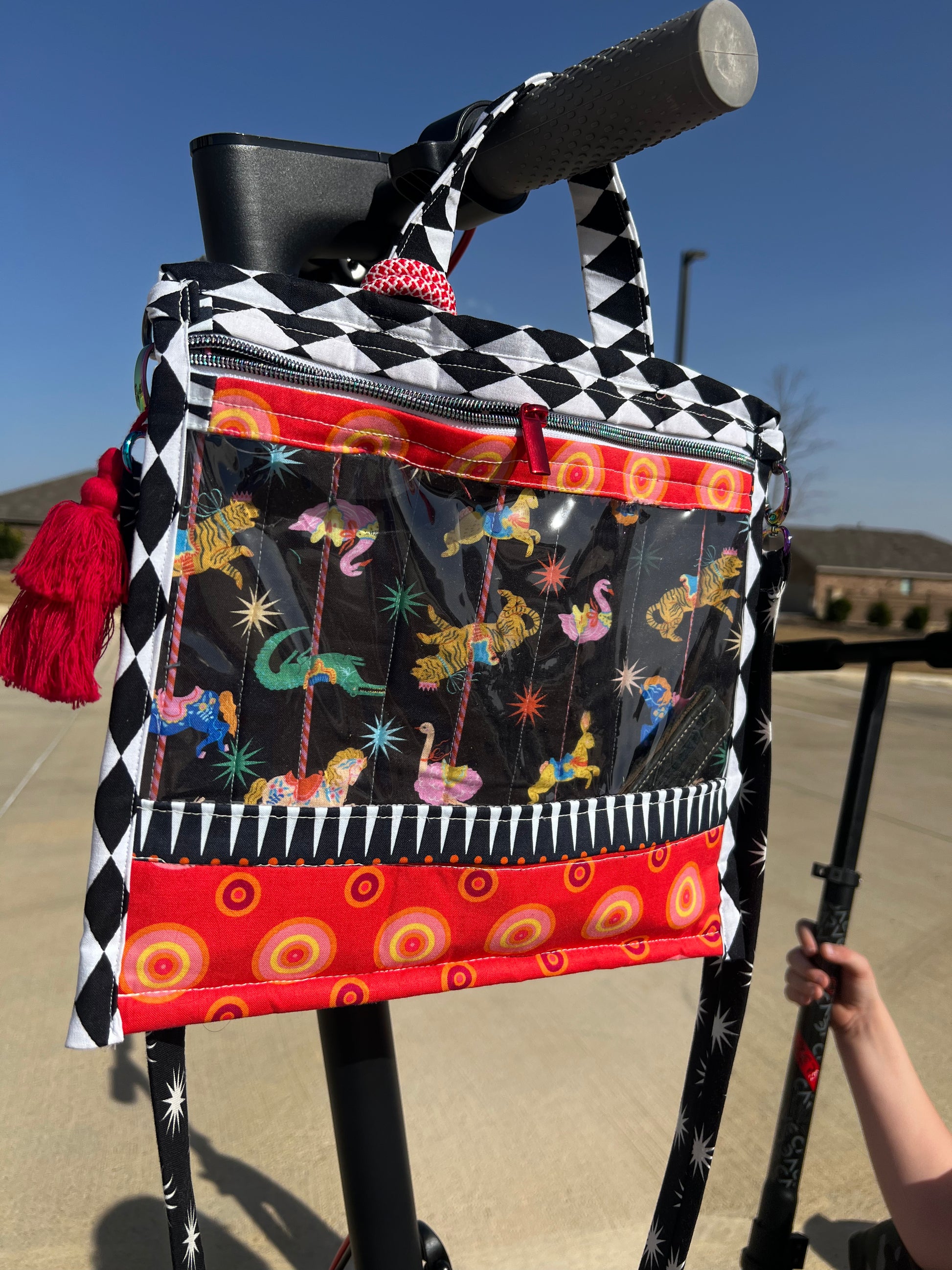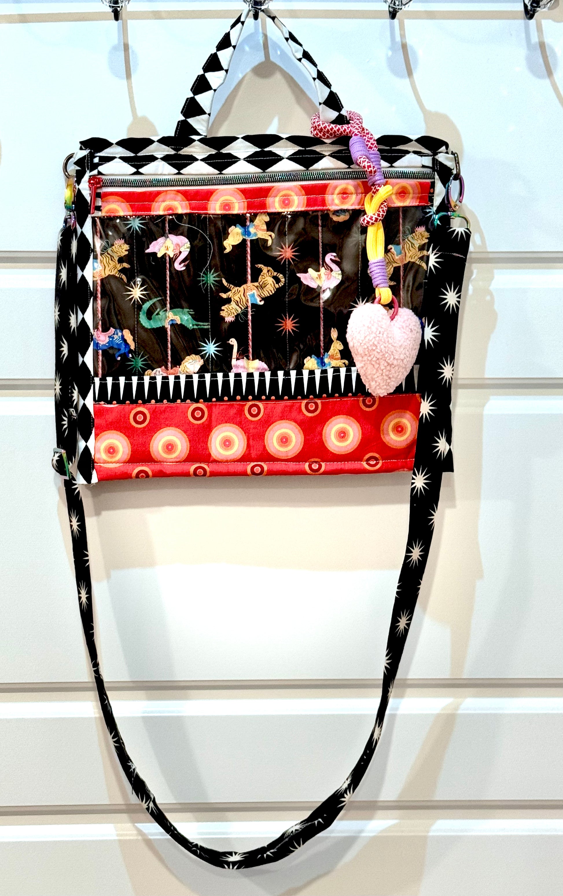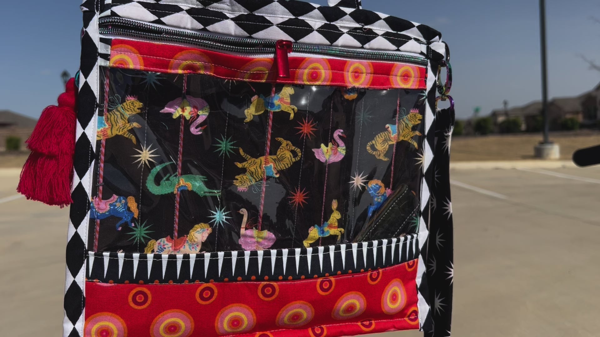 Introducing our Medium Project Bag in a beautiful Circus Carousel Themed fabric from TICKET TO RIDE by Faye Guanipa for Dear Stella. This bag features a fun red geo print from MODA, and a black and white diamond pattern. Perfect for all your crafting needs, with a vinyl see-through pocket for easy access and storage. Its light weight and plushy feel make it a versatile piece that doubles as a clutch or small purse. Elevate your crafting experience today.
