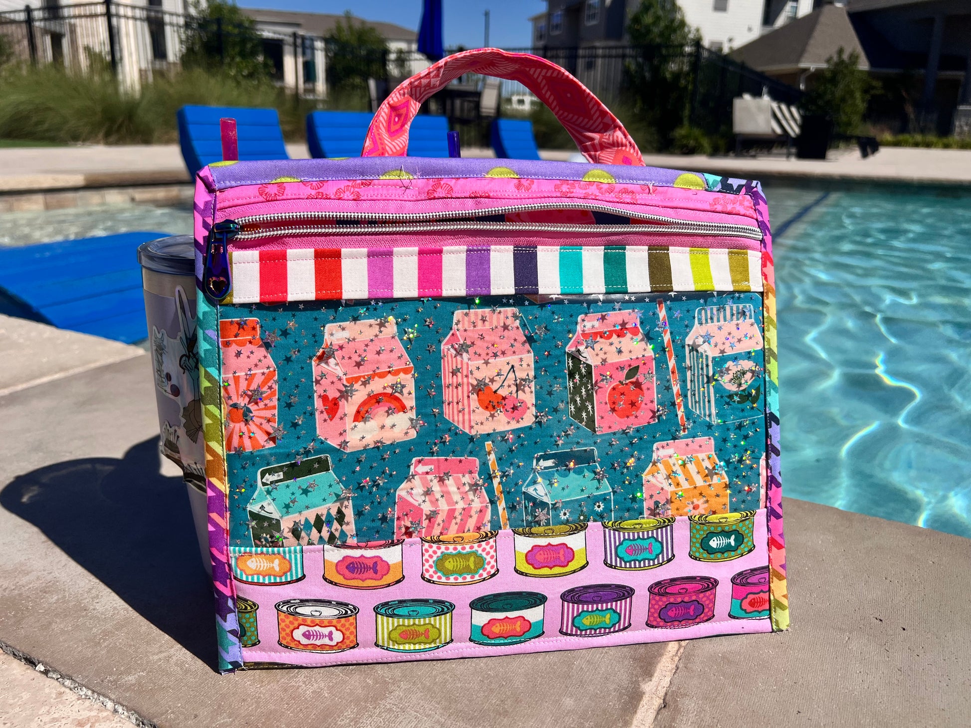 Elevate your knitting project with our My Little Soda Pop Project Bag, featuring a medium size and a sleek strap handle for easy carrying. The zipper closure ensures your project stays secure and the starry holographic vinyl adds a touch of luxury. Made with stunning Ruby Star Society fabrics, this bag is both juicy and stylish. Two pink fish cans, perfect for storing needles or notions, complete the exclusive package.