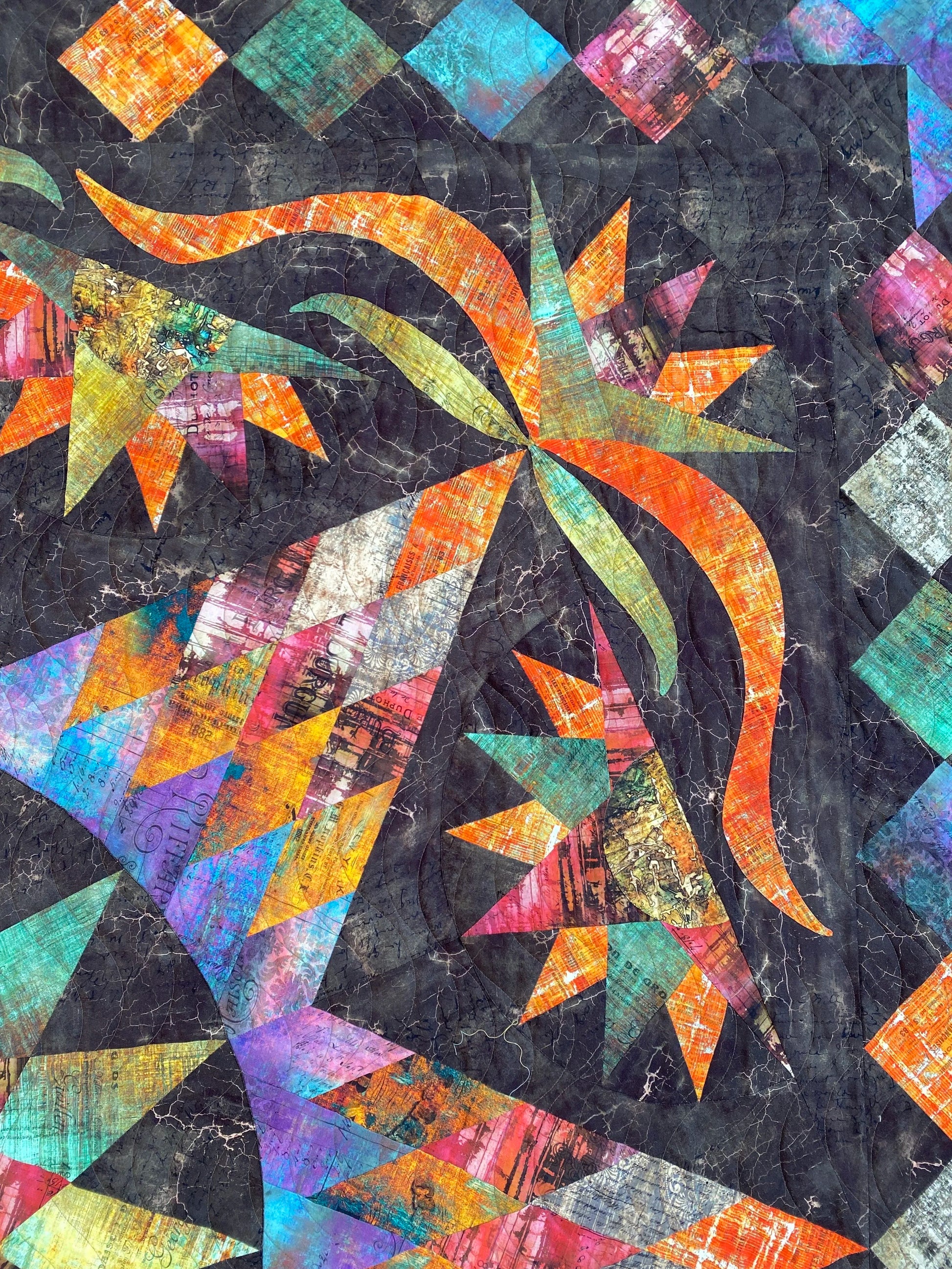 92”x100” quilt features a fussy cut center medallion nested inside gloriously colored stars and surrounded by pieced diamonds and appliquéd ribbons in a show stopping queen quilt. Features the fabrics from the Abandoned collection by Tim Holtz for FreeSpirit Fabrics. Queen. Made using the Fat Robin 16-Point Mariner’s Compass Book and Ruler combo (or the former Fat Robin 60˚ Mariner's Compass Book and Ruler combo and Fat Robin Companion Booklet).