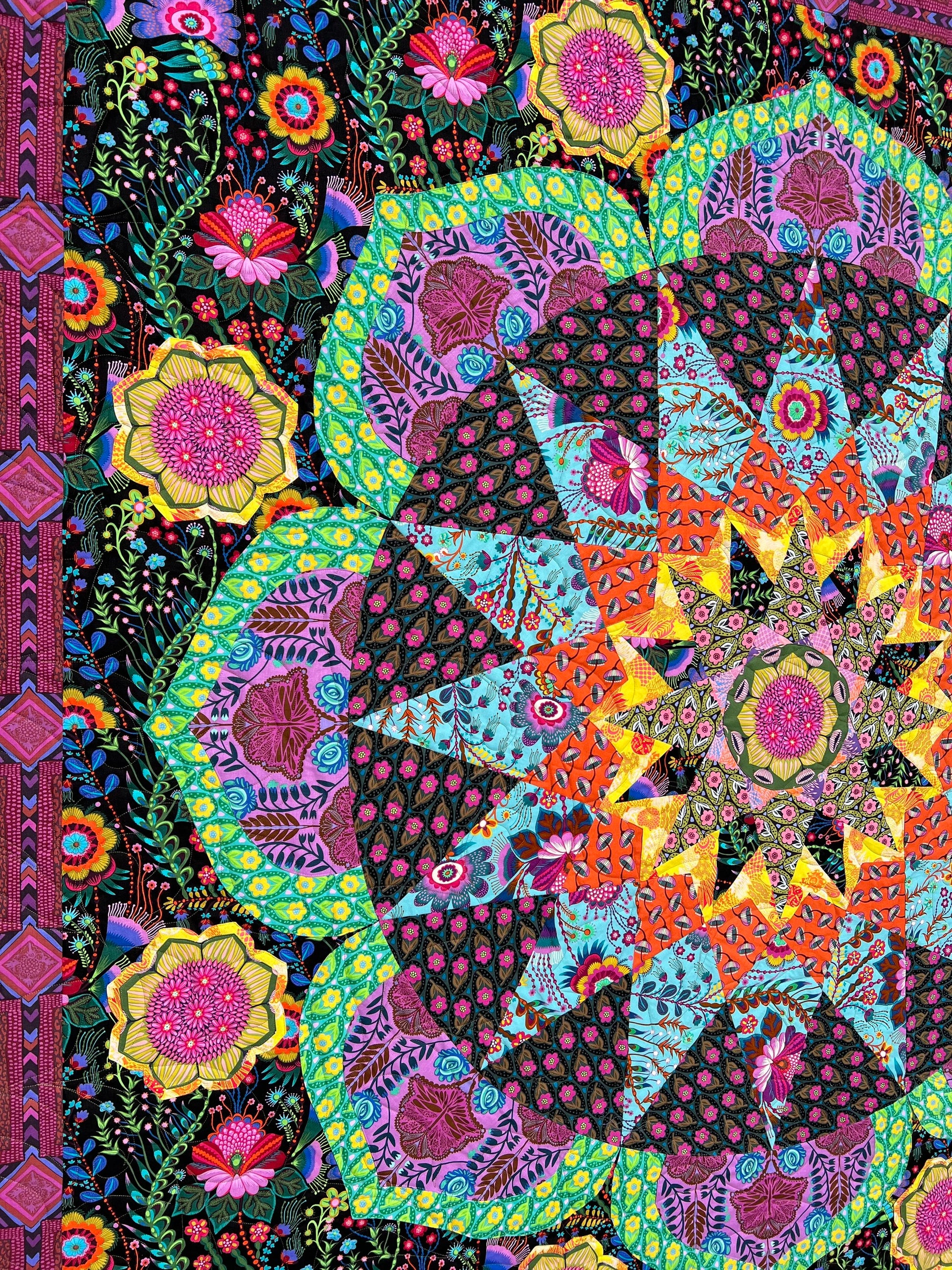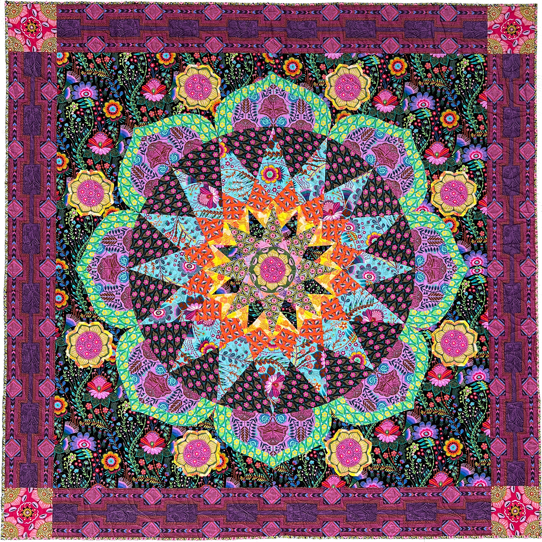 Flower Power (87”x87”) is a dynamic medallion quilt featuring two nested compass blocks surrounded by petals and flower faced appliqué elements. Fussy cut borders set off this quilt that is made using the Brave fabric collection by Anna Maria Horner for FreeSpirit Fabrics. This pattern is also available as a sew along on my website under the Member Sew Alongs tab for $10 which gives you exclusive access to the video tutorials to make this entire quilt top. Made using the Fat Robin 16-Point Book/Ruler Combo.