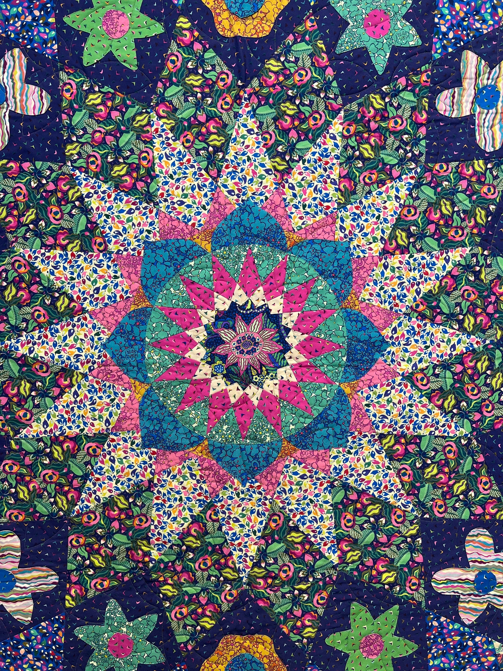 Radiant Garden (100”x100”) - This quilt features a center medallion composed of three nested compass variation blocks, with flower faced appliqué elements, and more flowers and leaves that radiate around the medallion. Features the gorgeous Botanica fabric collection by Sally Kelly for Windham Fabrics. Made using the Fat Robin 16-Point Book/Ruler Combo.