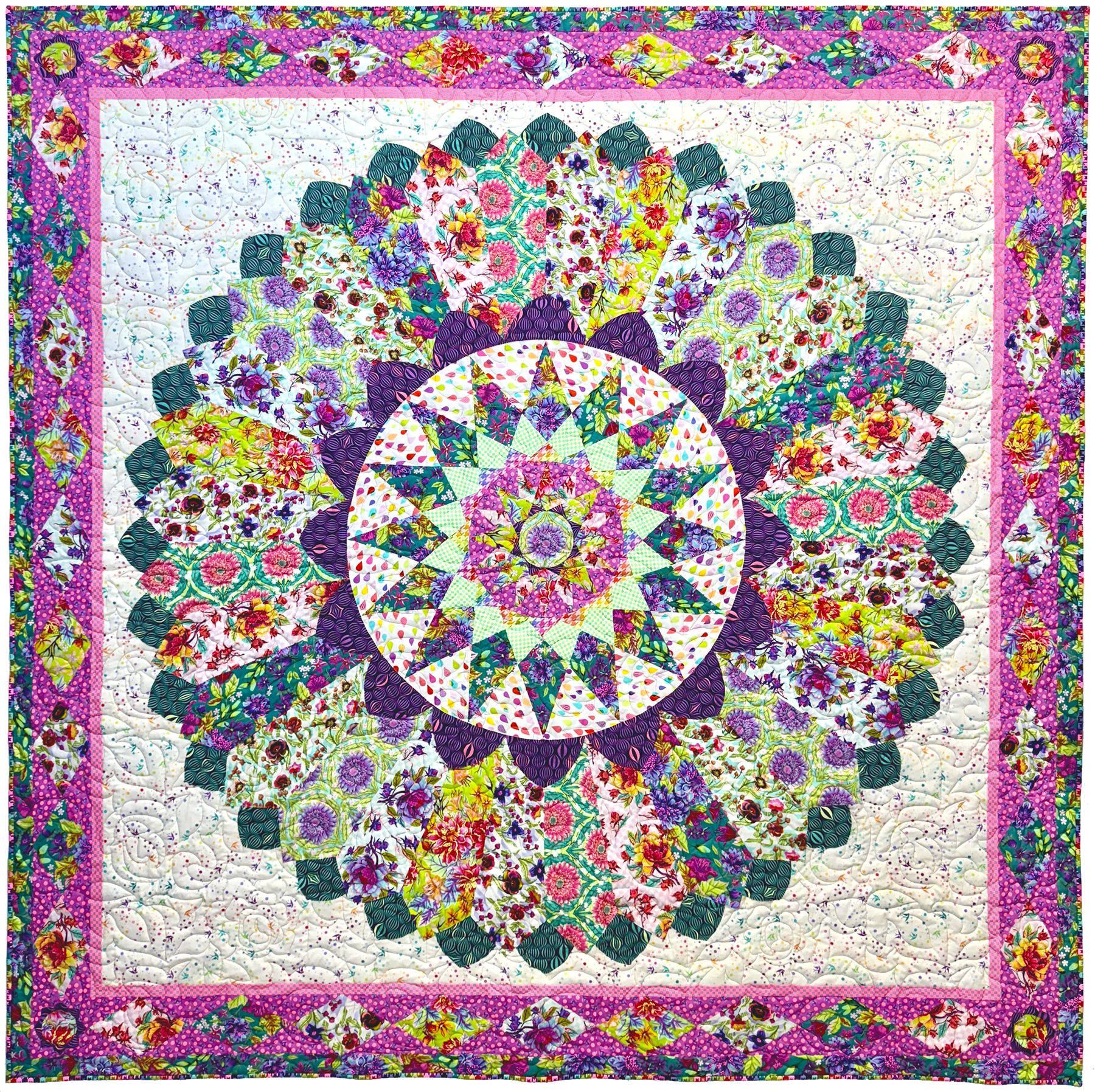 95"x95" quilt featuring the Untamed fabric collection by Tula Pink for FreeSpirit fabrics! Quilt elements include a 14” Compass Sunflower block nested inside a 36” Round Sunflower block, Dresden band, faced appliqué petals, and a diamond pieced border.