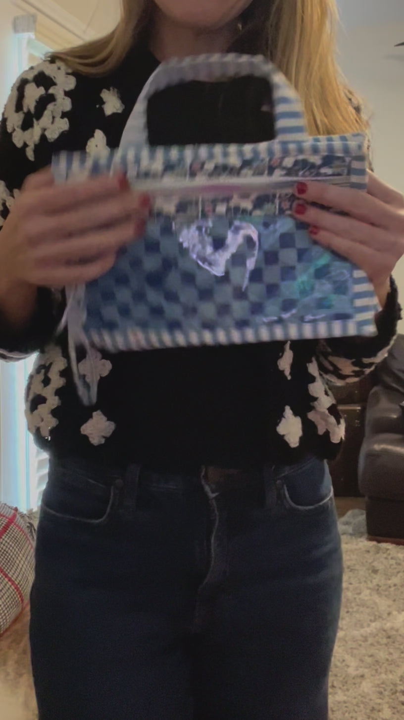 Introducing our Small Project Bag in a beautiful blue check batik print, featuring a luxurious Tilda fabric in her Jubilee collection and gold sewing machine zipper pull. Perfect for all your crafting needs, with a vinyl see-through pocket for easy access and storage. Its light weight and plushy feel make it a versatile piece that doubles as a clutch or small purse. Elevate your crafting experience today.